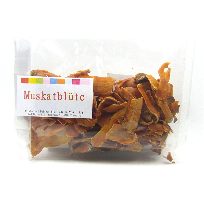 Die Muskatblüte ist ein spitzenartiger Mantel, der den Kern (Muskatnuss)umhüllt. Sie ist feiner im Geschmack als die Nuß, man verwendet sie besonders gerne an hellen Saucen, Bechamelsauce, Hühnerbrühen, Eiergerichten. Ansonsten kann man sie überall auch da verwenden, wo man die Muskatnuss gebraucht. An Kartoffelbrei, Spinat, Blumenkohl, Gemüsesuppen, Käsefondue aber auch an Fisch + Fleischgerichten.